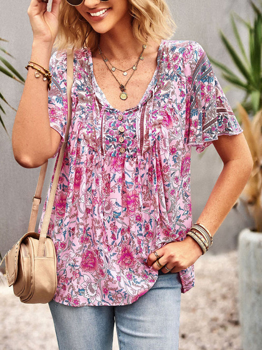 Women's V Neck Short Sleeve Printed Short Sleeve Shirt