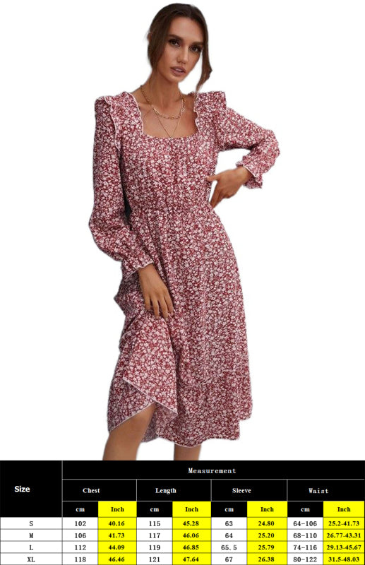 Ladies Square Neck Long Sleeve Ruffled Floral Dress