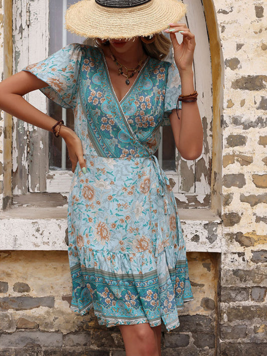 New Women's Dress V Neck Fashion Print Ruffle Dress