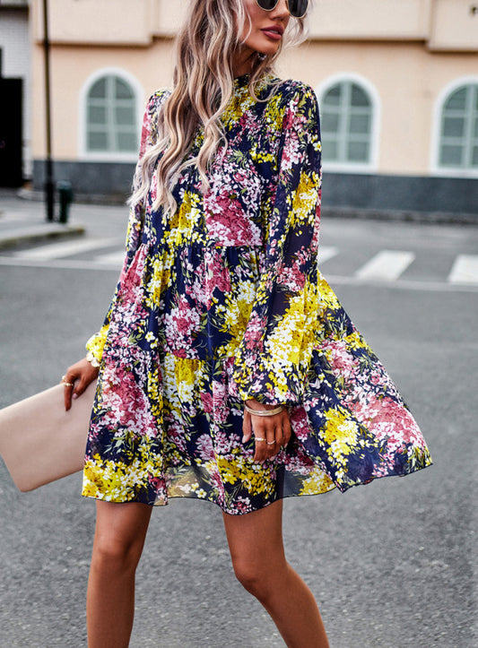 Women's High Neck Stretch Ruffle Long Sleeve Dress