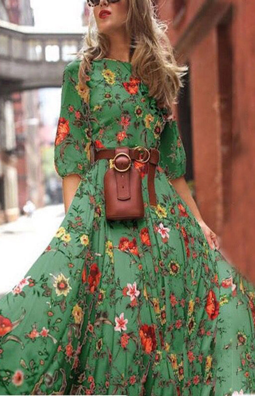 Women's Floral Dress Summer Temperament Elegant Waist Short Sleeve Long Dress