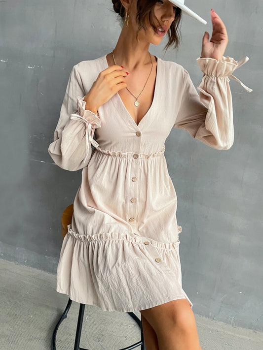 Women's splicing wooden ear dress V-neck long-sleeved dress