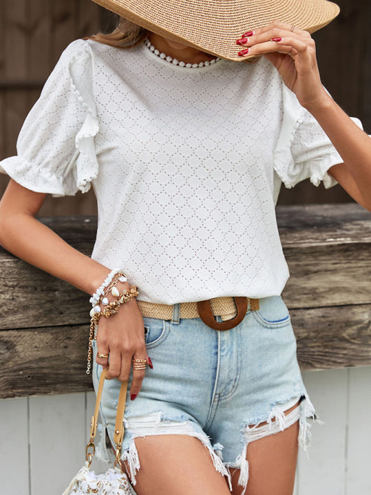 Women's Solid Color Ruffle Puff Sleeve Knit Top