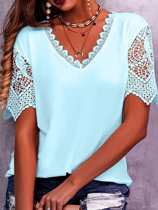 Women's Solid Color Lace Trim Short Sleeve Media Top